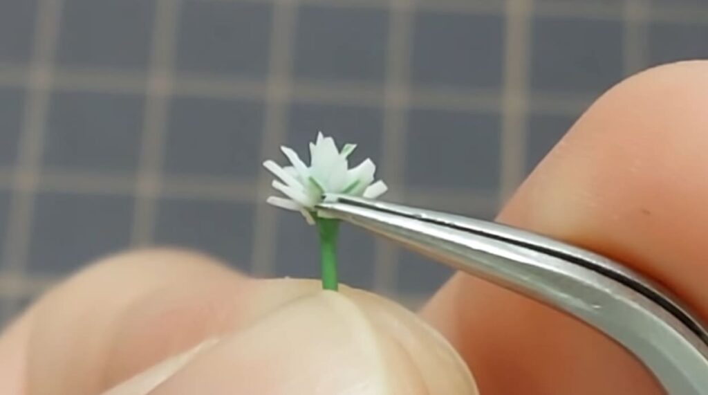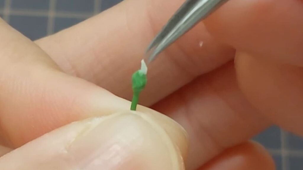 千日紅の花びらのパーツは、三角形の尖っている方をピンセットで挟んで少量の接着剤をつけたらすぐに茎の先端に貼り付けていきます。
