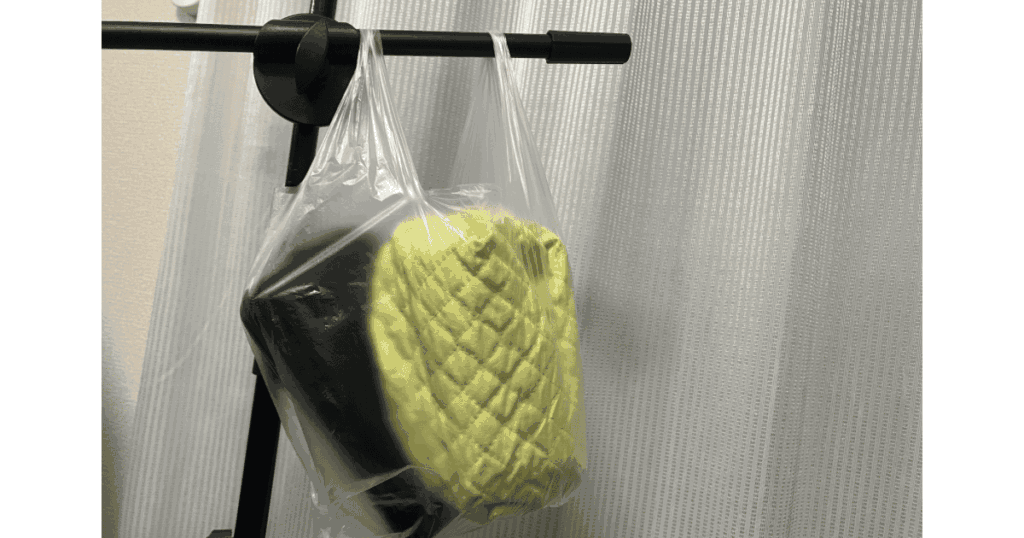 私は大量のペンが入った巾着とスパチュラをビニール袋に入れてぶら下げることが多いです。(汚くてすみません…)